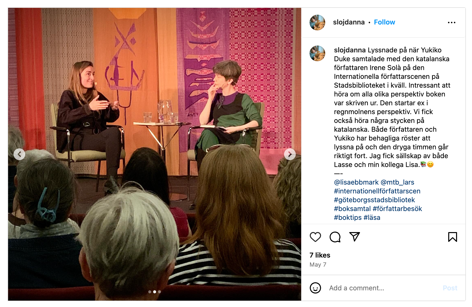 A Malmö va compartir acte amb Rasmus Daugbjerg, escriptor danès, i l'artista i intel·lectual islandès Sjón, a la biblioteca pública de Malmö.